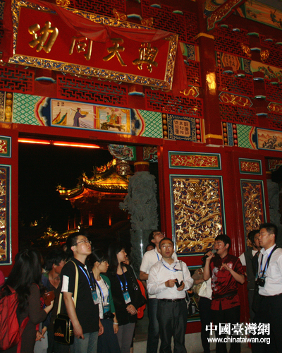采訪團記者們在參觀臺兒莊古城內(nèi)的媽祖廟。(中國臺灣網(wǎng) 郭瑩瑩 攝)