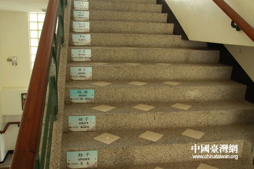 每個(gè)樓梯臺(tái)階都有關(guān)于服裝類的中文、英文、閩南語貼畫。(中國(guó)臺(tái)灣網(wǎng) 李丹 攝)