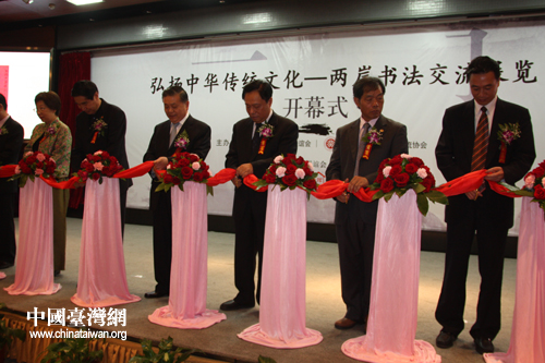 “弘揚(yáng)中華傳統(tǒng)文化--兩岸書法交流展覽”于6月1日在北京臺灣會館開幕,出席嘉賓在開幕式上剪裁。(中國臺灣網(wǎng) 陳寧 攝)