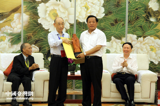 山東省委常委、統戰部部長顏世元向參加“情系齊魯”活動的臺灣嘉賓贈送孔子像。(中國臺灣網 芮益芳 攝)