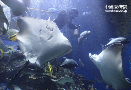 在北京動物園海洋館的“海底環游廳”里,飼養員正在為“土魟”喂食(中國臺灣網 黃艷艷 攝)