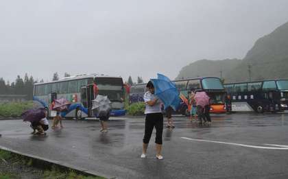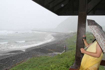 豐濱鄉(xiāng)東海岸石梯坪風景區(qū)風強雨驟,大陸客持傘當盾牌,逆風觀浪。圖片來自臺媒