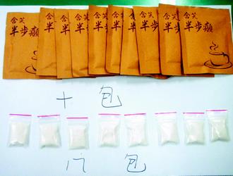 警方表示,“含笑半步癲”是將K粉及搖頭丸混合研磨成粉末,再摻入沖泡咖啡粉,制成速溶包,加入水、飲料、酒類服用后,使用者先會變得很high,接著出現幻想、幻聽,之后會變得癱軟無力。