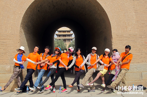 瑤族、滿族、回族、水族、畬族、藏族的學子們與臺灣青年做著臺灣阿美人“大拉手”的動作,連接城門左右兩邊,這是屬于“黃河探秘—西北風情研習營”的專屬風景線。(中國臺灣網 張潔 攝)