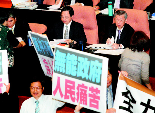 臺“立法院”昨天舉行“院會”,雖然臺當局“行政院”已宣布電價緩漲,民進黨“立院”黨團仍于“院會”正式提出對臺當局“行政院長”陳沖不信任案,臺聯(lián)黨團也予以支持,兩黨于議場內高喊“換‘內閣’、救經濟”,臺當局“行政院長”陳沖(后右一)也因此無法上臺進行施政報告。圖片來源來源:臺灣《聯(lián)合報》