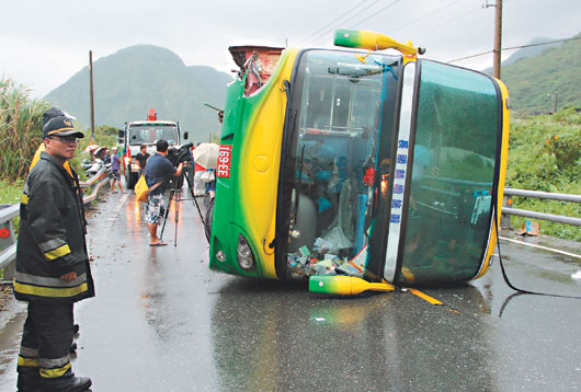 北京游客團昨行經花蓮縣豐濱鄉石梯坪路段時,打滑翻車,造成31名旅客輕重傷。(圖片來自臺灣《聯合報》)
