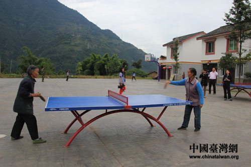 災后重建的先鋒鄉松林村居民安居樂業。圖為村里兩位老人在打乒乓球,她們嫻熟的球技吸引了前來參觀的兩岸記者。(中國臺灣網 王曉蕊 攝)