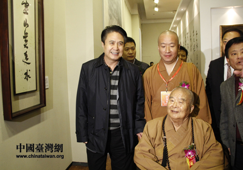 海南省委書記、省人大常委會主任羅保銘陪同星云大師細細參觀了一筆字書法展。(中國臺灣網 馬萌攝)