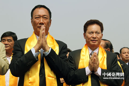 臺(tái)灣鴻海集團(tuán)董事長郭臺(tái)銘迎駕。(中國臺(tái)灣網(wǎng) 李典典 攝)