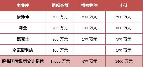對于此次四川雅安蘆山地區遭逢巨變,頂新國際集團下轄的康師傅控股、德克士、味全、全家便利將總計投入1000萬元人民幣現金作為災區重建基金,隨著整體復原計劃展開后,持續展現對受災民眾的關懷。加計集團400萬元人民幣的救援物資,頂新國際集團與下轄的各事業將對災區投入共1400萬人民幣的支持,與受災民眾共度難關,期盼未來。