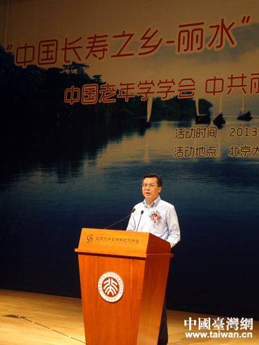今天上午,中國老年學(xué)學(xué)會(huì)與浙江省麗水市委、市政府在北京舉行“中國長壽之鄉(xiāng)—麗水”授牌儀式暨新聞發(fā)布會(huì),中國老年學(xué)學(xué)會(huì)正式授予麗水為“中國長壽之鄉(xiāng)”。圖為浙江省政府副省長盧子躍講話。(中國臺灣網(wǎng) 王偉 攝)