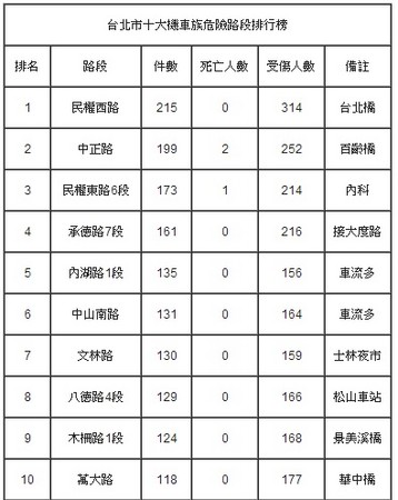在十大危險(xiǎn)路段中,最危險(xiǎn)的要數(shù)民權(quán)西路,此路段銜接臺(tái)北大橋至新北市,為上班族上下班的必經(jīng)要道,非常容易因人員擁擠致使發(fā)生交通事故,而中正路銜接百齡橋至新北市,也因路段人流量高致使出事幾率增加,此外,其它路段則因?yàn)榕R近重要場(chǎng)所或車流量高而事發(fā)頻繁。