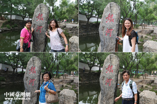 熱河名稱來源自蒙語“哈倫告盧”,意思是熱的河流,流經承德市的武烈河,上中游有溫泉注入,故而冬日非嚴寒而不封凍。冬日清晨,水汽遇寒冷空氣而凝結成霧,故稱熱河。圖為臺灣媒體友人紛紛與熱河石碑合影。(天津市臺辦 劉晟 攝)