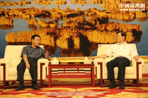 寧夏自治區黨委宣傳部部長蔡國英(右)會見了以國臺辦新聞局局長楊毅為團長的兩岸記者采訪團一行。(中國臺灣網 王文英 攝)