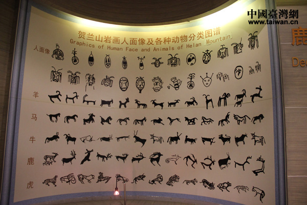 賀蘭山巖畫人面像及各種動物分類圖譜。(中國臺灣網 王文英 攝)
