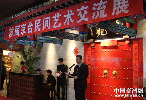 首屆京臺民間藝術交流展于2013年9月26日隆重開幕,北京市臺辦、北京市臺聯、中華青年企業家協會、北京大碗茶文化發展有限公司、北京老舍茶館有限公司的領導和嘉賓出席剪彩儀式。(中國臺灣網 楊永青 攝)