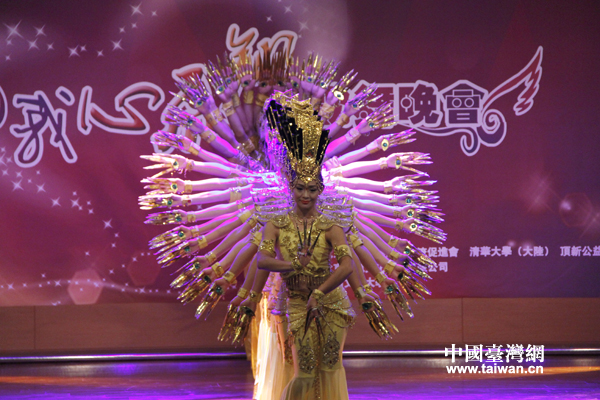 第六屆中華文化快車——北京心靈呼喚藝術團7日晚間在臺灣中國文化大學舉辦歌舞晚會,圖為演員們表演敦煌舞蹈《千手觀音》。(中國臺灣網 普燕 攝)