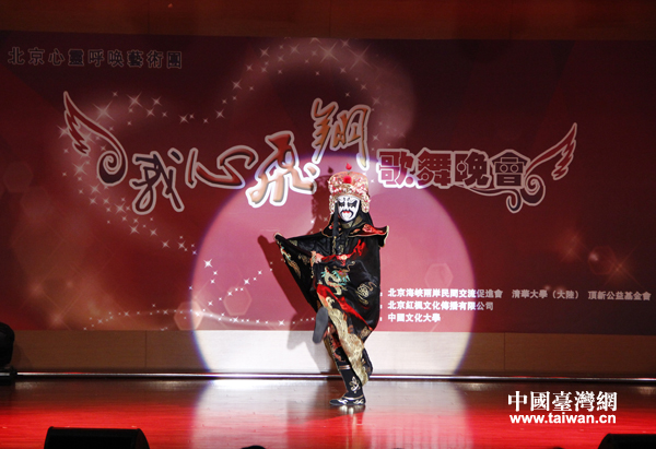 第六屆中華文化快車——北京心靈呼喚藝術團7日晚間在臺灣中國文化大學舉辦歌舞晚會,圖為演員們表演川劇《變臉》。(中國臺灣網 普燕 攝)