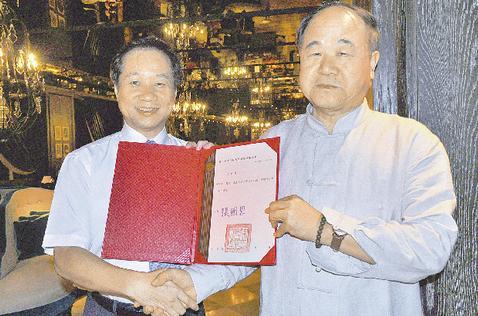 臺師大校長張國恩(左)正式將聘書交給莫言,邀請他擔任講座教授。(圖片由臺師大提供)