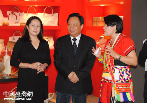 11月7日上午,全國臺聯黨組書記梁國揚(中)在臺灣地區民意代表高金素梅(左)陪同下參觀第八屆文博會臺灣文創精品館。(北京市通訊員 郭寧 攝)