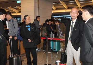 張安薇的哥哥(后)與許立民的二哥(左)準備前往登機。(臺媒圖)