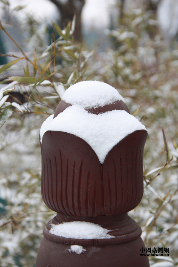 被雪覆蓋的欄桿裝飾物。(中國臺灣網 王文英攝)