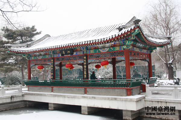 大觀園沁芳亭上著白衣。(中國臺灣網 王文英攝)