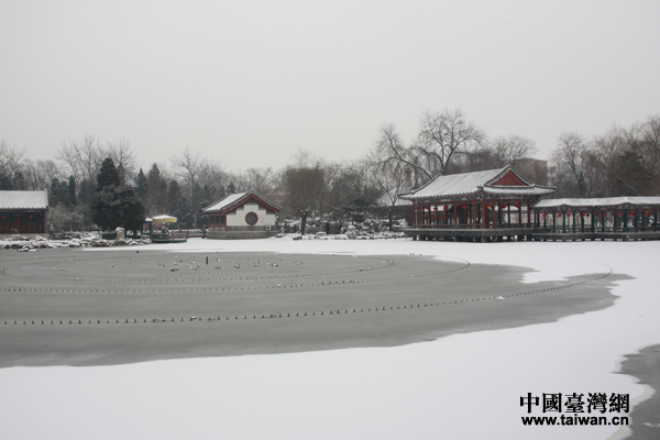 遠攝雪中的北京大觀園湖泊。(中國臺灣網 王文英攝)