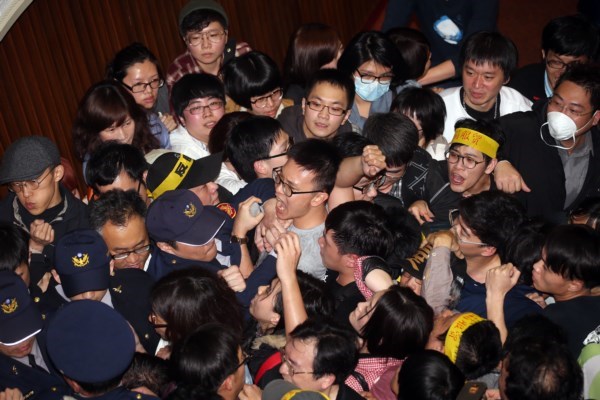 為表達(dá)對(duì)國民黨“召委”張慶忠17日在“內(nèi)政委員會(huì)”中,宣布將《兩岸服貿(mào)協(xié)議》直接送臺(tái)“立法院院會(huì)”存查的不滿情緒,昨晚在臺(tái)“立法院”外“守護(hù)臺(tái)灣民主之夜”的抗議學(xué)生和民眾,晚間9點(diǎn)多沖破“立院”大門,上百位學(xué)生更進(jìn)一步直奔議場占據(jù)主席臺(tái)。直至凌晨1點(diǎn)左右,臺(tái)“立法院”外、濟(jì)南路上已經(jīng)陸續(xù)聚集1000多人,仍有民眾從面對(duì)群賢樓右側(cè)的入口傳送物資,或著進(jìn)入議場。