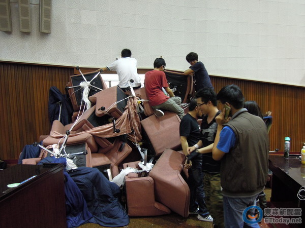 學(xué)生將議場內(nèi)椅子迭成一道墻,阻擋警方進(jìn)入。(圖片來自臺媒)