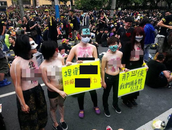 中國(guó)臺(tái)灣網(wǎng)3月31日消息 據(jù)臺(tái)灣媒體報(bào)道,昨日反服貿(mào)團(tuán)體集結(jié)上凱道,現(xiàn)場(chǎng)有人頭戴鹿角,有人大口吃著太陽(yáng)餅,而最引人注目的莫過(guò)于5名女子裸上身,在胸前寫著“我不服”,大膽行為激起網(wǎng)友熱烈討論。