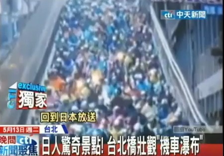 據臺灣《中天新聞》報導,日本節目的工作人員特別趁著交通高峰時間,約莫清晨7、8點時來到臺北橋實地拍攝,拍下讓日本節目的來賓與主持人同聲驚嘆的“摩托車瀑布”。