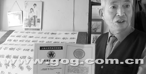 今年3月,王鳳成完成208米的萬壽長卷的創(chuàng)作后,好友建議他申報世界紀(jì)錄。他把208米的萬壽長卷裝裱,經(jīng)過貴陽市公證處公證后,向上海大世界基尼斯總部,申報世界基尼斯紀(jì)錄。專家對他的萬壽長卷審定后,認為他的萬壽長卷中的每一個“壽”字,均是由不同歷史演變而成,寫出20008個“壽”是世界之最。