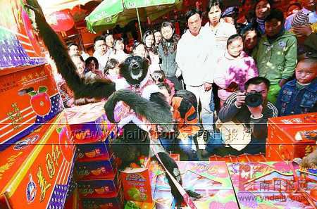 年貨購(gòu)好后,“叮叮”拿著已經(jīng)屬于自己的香蕉啃了起來(lái),時(shí)而很高興,時(shí)而又發(fā)出好像很難吃的聲音,把圍觀(guān)的人都逗笑了。為了讓“叮!焙托『镒赢(dāng)一回真正的“購(gòu)物狂”,云南野生動(dòng)物園副總經(jīng)理丁燁鋒決定再帶它們?nèi)サ浇瘃R碧雞坊給市民拜早年!岸6!焙托『镒庸涞搅四掀敛叫薪值哪曦浗,買(mǎi)了糖和帶“!弊值闹袊(guó)結(jié)。“春節(jié)馬上就要到來(lái),為了給小動(dòng)物過(guò)春節(jié),特意讓小動(dòng)物們自己到年貨街辦年貨,挑選喜愛(ài)的食物。
