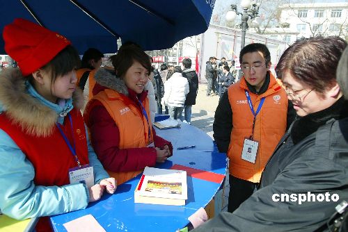 2月9日,農歷大年初三,北京奧運會志愿者工作協調小組辦公室、團市委、北京志愿者協會在全市開展北京奧運會城市志愿者"春節服務周"城市志愿服務活動。在這期間將有一萬余名城市志愿者在全市重要交通樞紐、商業網點、旅游景點、餐飲住宿等地設立的100個城市志愿服務站點,為公眾提供信息咨詢、應急服務和語言翻譯等志愿服務。 中新社發 富田 攝