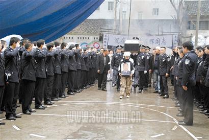 一個普通的社區民警因工作勞累突發心臟病,猝死在值班室,上千名群眾自發冒雨為這個他們心中的好民警送行。3月9日上午,蒙蒙細雨中傳來陣陣哀樂,四川合江縣公安局合江鎮派出所百花亭社區民警李正輝追悼大會在合江縣百花亭球場舉行。除了李正輝的戰友和親屬,黑壓壓的站在細雨中為他送行的是上千名社區居民。他們或臂戴黑紗、或手握白花,在李正輝的遺體前深深地鞠躬。