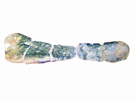 目前,已挖掘出土的化石有股骨、趾骨、和一些關節(jié)骨頭,已收集骨頭30多塊。還有部分骨化石包裹在巖石里面,株洲市文物局已運回兩車巖石,將對其進行切割、清理。考古人員將恐龍化石的趾骨、股骨拼湊起來,經測量趾骨約20厘米,股骨長約77厘米,接近屁股段的股骨化石寬約22厘米,考古專家推測其腿部高在2米以上,據此可推斷是巨型恐龍。
