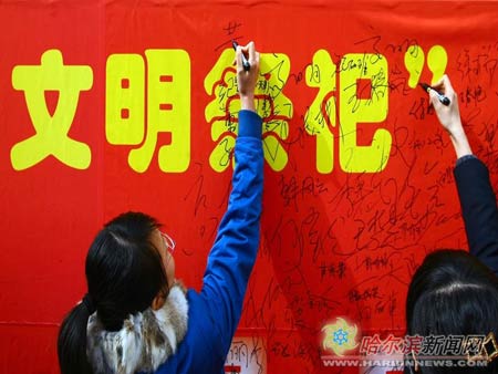 哈爾濱市民政局黨委書記趙愛俐說:“我們通過開展萬人簽名活動,大力倡導(dǎo)文明祭祀,樹立和諧健康、文明時尚的社會新風(fēng),使廣大祭掃群眾自覺采取社區(qū)公祭、網(wǎng)上祭祀、庭院祭祀、鮮花祭祀、心語祭祀、簽名祭祀、植樹祭祀、音樂祭祀等方式來進(jìn)行文明緬懷,摒棄到處焚燒冥紙冥幣、焚燒迷信祭品、拋灑紙錢等封建陋習(xí)。”