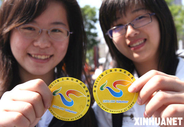 5月1日,在世博會(huì)志愿者虹口區(qū)招募點(diǎn),上海外國語大學(xué)的兩名女生在現(xiàn)場報(bào)名后獲得上海世博會(huì)志愿者標(biāo)志作為紀(jì)念。