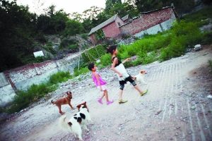 孩子在金頂山村玩耍。蘋果園附近的金頂山村居住著百余乞討人員。記者 王嘉寧 攝