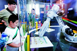 昨日,一個(gè)孩子正在和機(jī)器人下象棋。該機(jī)器人可同時(shí)和三個(gè)人下象棋、跳棋和五子棋。