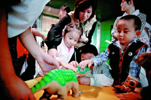 昨日,幾個(gè)孩子對(duì)科技館里銷售的寵物恐龍愛不釋手。
