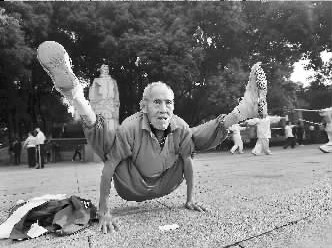 昨日清晨,91歲的肖清連老人在湖北省武漢市施洋烈士公園內(nèi)表演“功夫”,吸引了不少晨練者駐足觀看。