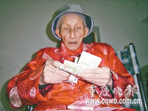 昨天下午,重慶江北區玉帶山社區工作者給李全盛送來300元慰問金。老人接過信封時,小女兒李桂花先將錢取出。