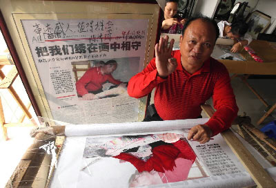 6年來,吳耀存對癱瘓妻子的不離不棄和對湘繡事業(yè)的艱難打拼感動著無數(shù)人。今年5月6日,《長沙晚報》以《把我們繡在畫中相守----湘繡企業(yè)家對癱瘓6年的妻子不離不棄》為題,作了大篇幅的報道,報道中寫道:吳耀存要把自己和妻子繡在一幅湘繡畫中長相守。
