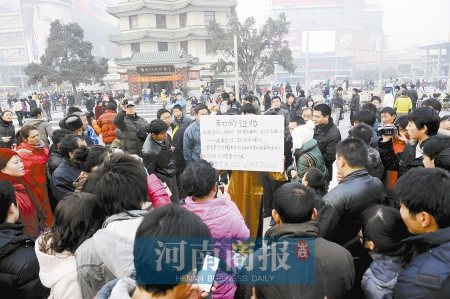 3日,“和尚”二七塔下征婚,引來大量市民圍觀、拍照