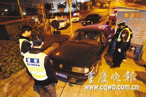 黑色桑塔納轎車停靠在人行道上 記者 楊帆 攝
