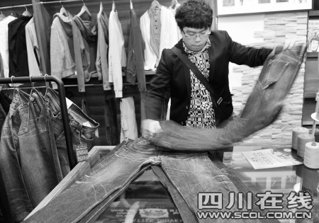 前日下午,“養(yǎng)牛人”之一的“豪豬”穿著一條已經(jīng)“養(yǎng)”了兩年的牛仔褲從北京回到成都。作為成都“養(yǎng)牛”的先驅(qū)者,27歲的他已經(jīng)“養(yǎng)牛”3年,現(xiàn)在手中有7條“牛”。說(shuō)起自己的“牛”,“豪豬”立即搬出了4條牛仔褲。“這條是‘養(yǎng)了’3個(gè)月的,這條半年。”豪豬說(shuō),“接下來(lái)這條一年,最后就是兩年的。”豪豬拿起“養(yǎng)”了一年的褲子,褲子后袋部位上一個(gè)T字形十分明顯。這個(gè)是他在其他牛友的啟迪下,將一個(gè)小方盒裝在后袋內(nèi)一個(gè)月磨出來(lái)的。“還能塞貓爪形狀的玩具,花紋酷酷的ZIPPO打火機(jī),很Q吧?”