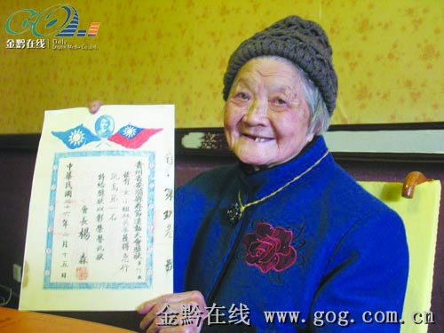 昨日中午,林英華老人在子女們的攙扶下,從貴陽來到安順,與張勇見了面。林英華老人看上去非常精神,當她從張勇手中接過這張73年前的獎狀后,樂得合不攏嘴,連聲說“今天太高興了,謝謝,謝謝”,還不停地翻看著上面的內容。