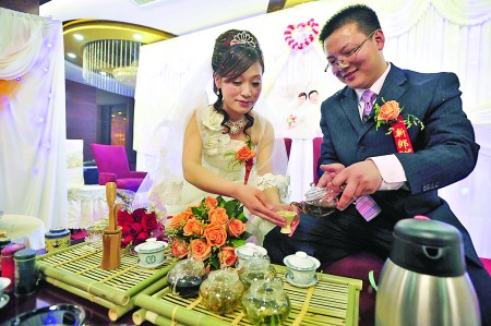 2日上午11時18分,省城無影山北路一家酒店內,在《高山流水遇知音》的樂曲聲中,一場別開生面的“茶道婚禮”正式上演。據了解,新郎和新娘都姓王,都是“80后”,喜歡追求新奇和與眾不同。五年前的一天,兩人在一家中式茶樓偶然相識,彼此都喜歡茶的他們,從單純喝茶聊到了茶文化,并且越聊越投機。之后喝西式下午茶時,兩人再次相遇。逐漸地,兩位茶友最終走到了一起。